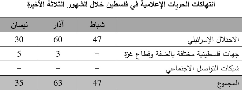 وانحصرت الاعتداءات التي سجلت خلال شهر نيسان الماضي بالاعتداءات الاسرائيلية وتلك التي ارتكبتها جهات فلسطينية في الضفة، حيث لم اي يوثق أي انتهاك يعود لشركات وشبكات وسائل التواصل الاجتماعي.