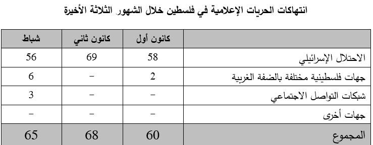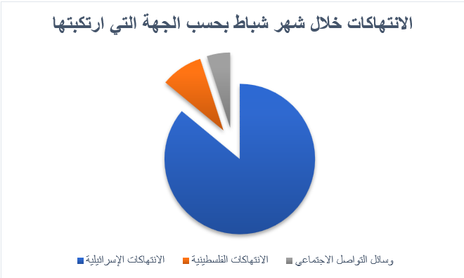 ورغم هذا التراجع الطفيف، بقيت الانتهاكات الإسرائيلية هي الأكثر عددا والأشد خطورة على حالة الحريات الإعلامية في فلسطين، حيث شكلت 86% من مجمل انتهاكات شباط، في حسن شكلت الانتهاكات الفلسطينية في الضفة وقطاع غزة ما نسبته 9% من مجمل الانتهاكات، أما انتهاكات منصات ووسائل التواصل الاجتماعي فقد شكلت 5% من جميع ما وثق من انتهاكات.