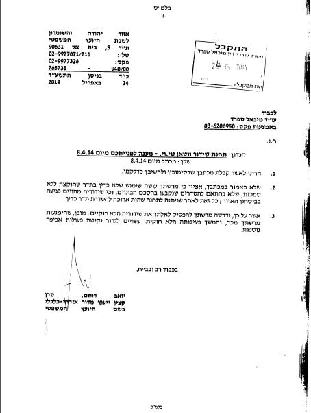 رام الله – 29/4/2014: قامت سلطات الاحتلال الإسرائيلي بإرسال كتاب إلى تلفزيون وطن في مدينة رام الله، طالبته فيه بالتوقف عن البث بشكل فوري وإلا