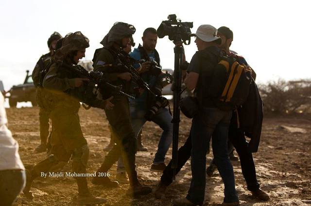 (17/11)- IOF attacked more than 9 journalists with beating and tear gas bombs and pepper spray as a try to ban them from covering a peaceful demonstration organized in Jordan valley area against settlements and demolishing Bedouin houses as AP cameraman Majdy Mohammad Ishtaieh (34 years) reported to MADA “I headed with a bunch of my colleagues including (Mohammad Turkman, Saed Hwari, photographer in Reuters, and Abbas Moumni AFP photographer, Feras Lutfi Sky News reporter, Abdulrahman Khabisa Sky Newscameraman, Hafeth Abu Sabra reporter of Roy’a TV, its cameraman Mohammad Abu Shousheh, and Khaled Sabarneh IRIB photographer) on 17/11 in the morning to the northern area of Jordan Valley to cover a peaceful demonstration against the continuity of settlements and demolishing Bedouins tents and homes, as the Committee of the Popular Resistance erected a tent named it after the village “Yaser Arafat” near the white spring close to the Bedouin area near the northern Jordan valley, noting that there were a settler near the place, afterwards the demonstrators started putting (Palestinian) flags on the settlers tents, while clashes took place between the settlers and the demonstrators, and after half an hours IOF came and started separation between the Palestinian demonstrators and Israeli settlers, they gave us (the journalists) half an hour to leave the place and threatened to oppress us if we didn’t comply, in half an hour the protestors brought lunch meals for everyone, meanwhile, IOF started shooting stun grenade and tear gas bombs towards everyone, and beating demonstrators, and when we (journalists/ photographers) distanced from the place in order to cover the clashes, IOF turned from assaulting the demonstrators to beating and hitting us and started targeting us with stun grenade and tear gas bombs to force us to stay away from the place, and pushed us out of the place and spraying us with pepper on the journalists faces, and these attacks lasted for more than half an hour”. (copy of Wattan report on the incident)
