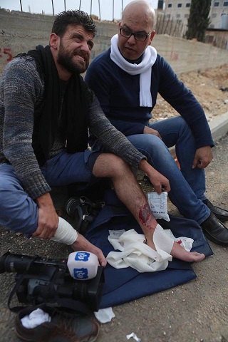 (23/12)- Three journalists were injured and suffocated, by IOF targeting and shooting stun grenade and tear gas bombs, during a peaceful march in Bethlehem during Christmas eve, as Mohammad Radi Shusheh (34 years), the cameraman and director in Roya Jordanian TV, reported to MADA “I headed to cover the march of Santa Clause, that started after Friday prayer near Karitas hospital in Bethlehem on Christmas, right near the check point (300) on the way to Jerusalem, which Palestinians are banned to enter without a permit, where IOF started shooting stun grenade and tear gas bombs, to separate the demonstration which ended with the injury of 4 journalists including a foreigner journalists who I don’t know”.