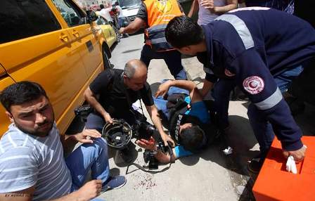 In May 2017, Israeli Occupation Forces committed a total of 23 attacks against media freedoms in Palestine (about 56% of violations recorded this month). The most prominent violations was the injured of the AP photographer Majdi Shtiah with a bullet in his hand when an Israeli settler opened fire towards a group of protesters in the town of Hiwara, which also led to the death of a demonstrator who was shot with a bullet in his head at the same moment. Also, four other journalists were injured by shrapnel from sound and gas bombs fired by Israeli soldiers at a group of journalists while covering a peaceful demonstration in Bethlehem. Other journalists were injured in this incident: Baladna Radio reporter Safia Omar Qawar, AFP photographer Mousa El-Shaer and the European Agency's photographer, Abdelhafeez Al-Hashlamoun, while AP photographer Ayad Nimer Hamad was severely suffocated. The editor of the Palestinian Center for Israeli Studies, one of the founders of the Palestinian Journalists Syndicate, Said Ayyash, was arrested and prevented from traveling for six months after a raid on his house. The director of Elia organization Ahmed Hassan Safadi was attached and arrested and prevented from covering any demonstration for three months. Al-Nour Printings Company in Ramallah was stormed for the second time in months; the Israeli forces confiscated the company equipment and devices (machines) and close it under the pretext of "incitement."