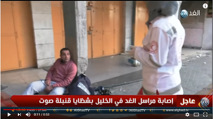 (12-11) Al-Ghad Al-Arab Al-Arab TV correspondent Raed Mohammed Al-Sharif (28 years) was hit by a sound grenade fired by an Israeli soldier while covering the clashes in Hebron. Al Sharif reported to MADA: "During the clashes that accrued in Bab al-Zawiyeh in Hebron that started at 10:30 am one of the soldiers who was standing on the roof of a house fired a sound grenade towards me, where it exploded between my legs, causing me a minor burn and some scratches in my right thigh”.