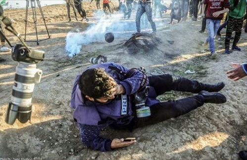 “Attiya Darwish” Al Ray Agency photographer was hit by a tear gas fired by the Israeli occupation forces while covering peaceful return march in Karni area, east of Gaza.