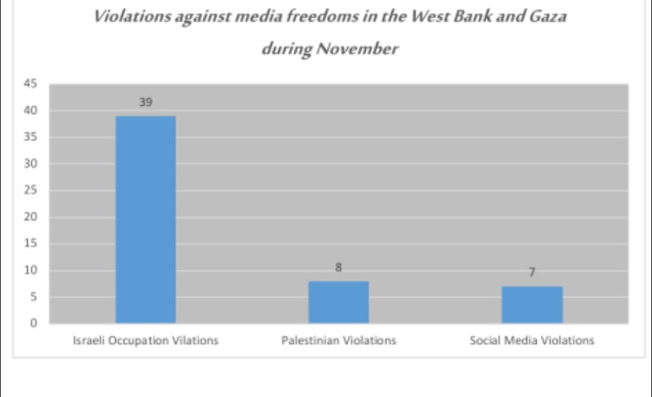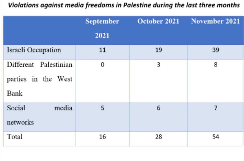 Ramallah - 12/13/2021 The Palestinian Center for Development and Media Freedoms (MADA) monitored and documented last November a total of (54) violations against media freedoms in Palestine, most of which were committed by the Israeli occupation forces, and all of them took place in the West Bank.