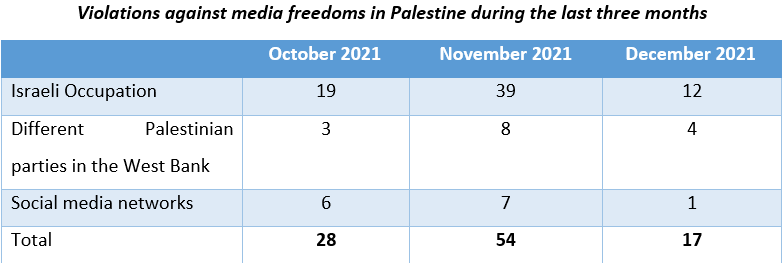 Ramallah - 11/01/2022 The Palestinian Center for Development and Media Freedoms (MADA) monitored during the month of December a total of (17) violations against media freedoms in Palestine, compared to (54) violations documented by MADA during last November, which represents a decrease of 69% in the number of violations.