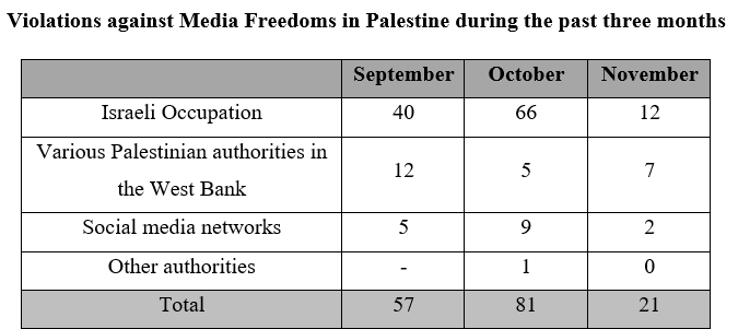 November did not witness any change in the number of Palestinian violations committed against media freedom in Palestine, as the number of such remained in the range of violations documented during the previous month.