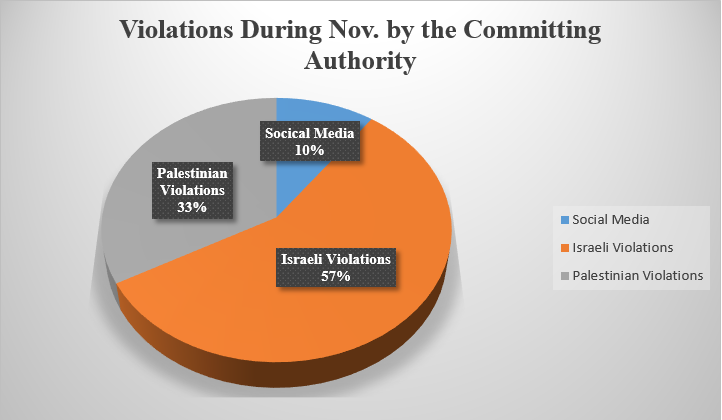 The violations documented during November were divided into (12) committed by Israeli authorities, (7) committed by various Palestinian authorities in the West Bank and Gaza Strip, and two committed by social media corporates.