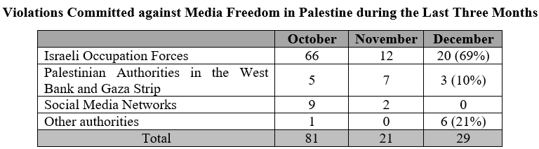 During the last month, the Israeli Forces and Authorities committed 20 violations of the total. As for the Palestinian Authorities, they committed 3 violations and there were no documented violations committed by the social media networks.