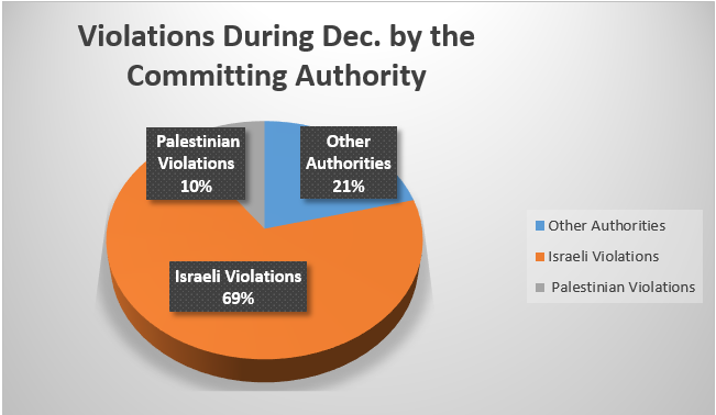 The number of Israeli violations has increased from being 12 violations committed in November to 20 violations in last December – 2022. The percentage of Israeli violations reached 69% of all violations committed during that month.