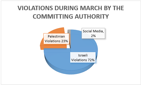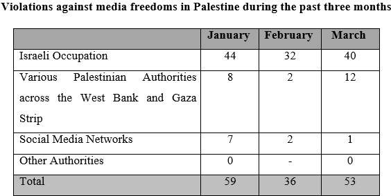 During March, the Palestinian Center for Development and Media Freedoms "MADA" has documented a total of 53 violations against media freedoms committed by the Israeli occupation and other Palestinian authorities in the West Bank and Gaza Strip, where the Israeli occupation committed a total of 40 violations, while various Palestinian parties committed 12 violations, and " Facebook" Platform committed one violation.