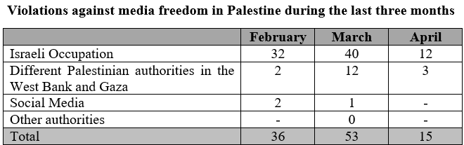 March witnessed an increase in the number of violations (total of 53 violations), as a result of the increase of Israeli violations against journalists during their coverage of the different incidents, especially in Nablus. Therefore, a total of 15 violations have been documented during the month of April, 12 of which were committed by the Israeli Occupation, whereas different Palestinian authorities in the West Bank and Gaza have committed a total of 3 violations, and none committed by social media.
