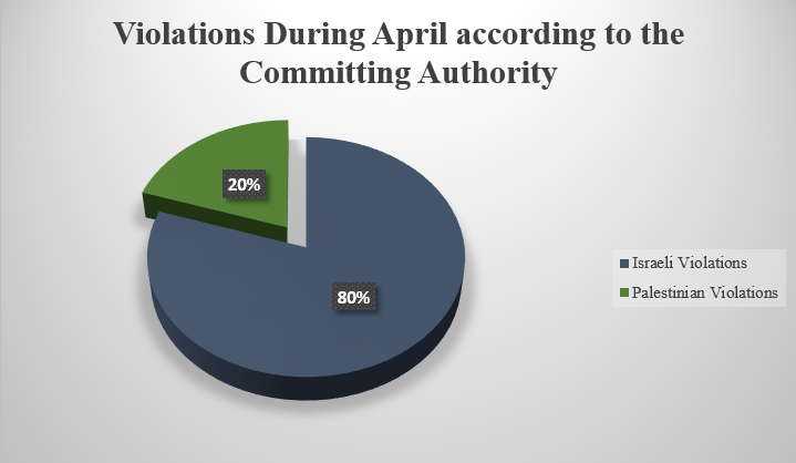 The Israeli Occupation authorities committed during April 12 violations with a percentage of 80% of the total violations committed during this month. Most of the violations are categorized as serious assaults against media freedoms and journalists and their ability to carry out their tasks.