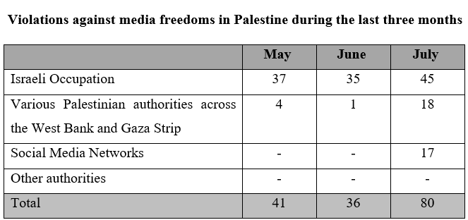 The Palestinian Center for Development and Media Freedoms “MADA” documented a total of 36 attacks against media freedoms in the West Bank during June, 35 of which were committed by the Israeli occupation, while Palestinian authorities in the West Bank committed one violation, and no violations were documented to have been committed by social media, knowing that the preceding month May witnessed 41 violations, 37 of which were committed by the occupation forces.
