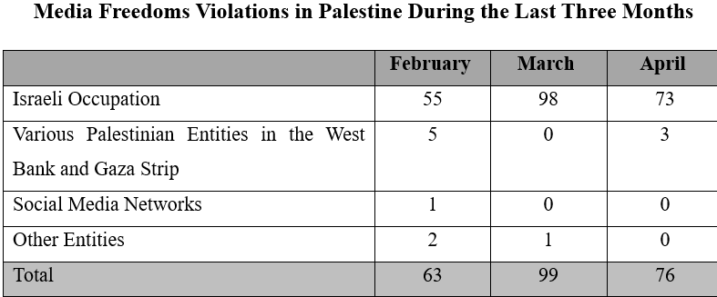 The number of documented Israeli violations against media freedoms in Palestine decreased during the month of April. MADA Center documented a total of seventy-three (73) crimes and violations committed by the Israeli occupation forces and authorities in the West Bank and Gaza Strip, representing 96% of all documented violations during the previous month, compared to a total of ninety-eight (98) violations documented during March.