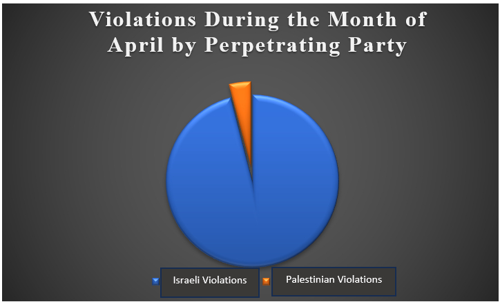 During the month of April, a total of 3 (three) Palestinian violations against media freedoms were documented, constituting 4% (four percent) of the total violations committed. Two (2) of these occurred in the Gaza Strip, while one (1) violation was committed by the Palestinian security services in the West Bank. These three (3) violations come in contrast to zero (0) Palestinian violations recorded during the previous month of March.