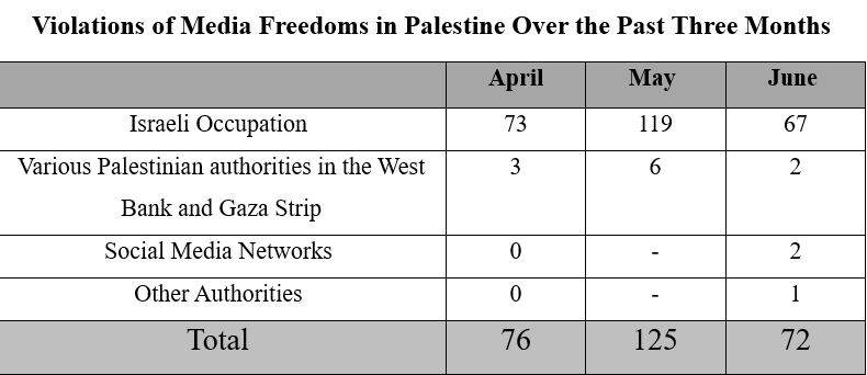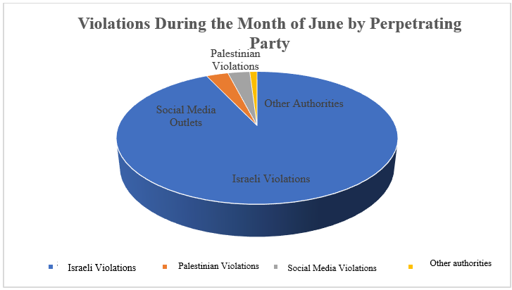 The MADA Center monitored and documented a total of seventy-two (72) violations against media freedoms in Palestine during the month of June. Israeli occupation forces were responsible for the vast majority, committing sixty-seven (67) violations, including serious crimes and assaults. Additionally, two violations were committed by unofficial Palestinian entities in the Gaza Strip, two others by the company Facebook, and one further assault was carried out by another party.