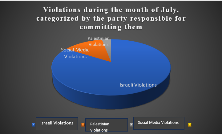 Of the seventy-three (73) documented violations, sixty-two (62) were committed by Israeli occupation forces, while nine (9) were carried out by various Palestinian actors in the West Bank and Gaza Strip. Additionally, two (2) violations were attributed to social media platforms.