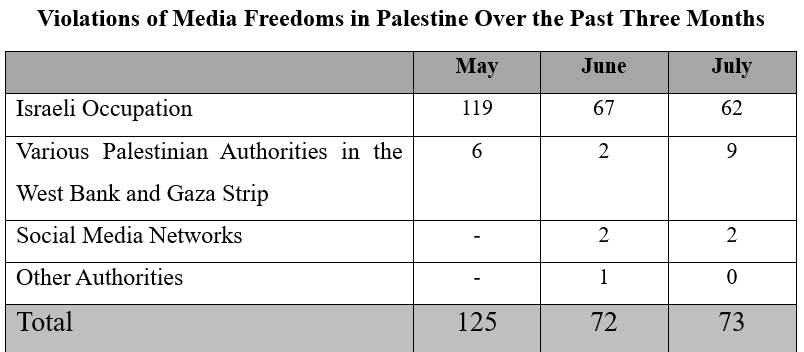 During the month of July 2025, Israeli occupation forces and authorities committed a total of sixty-two (62) crimes and assaults against media freedoms. This figure represents a seven percent (7%) decrease compared to June, during which sixty-seven (67) Israeli violations were documented.