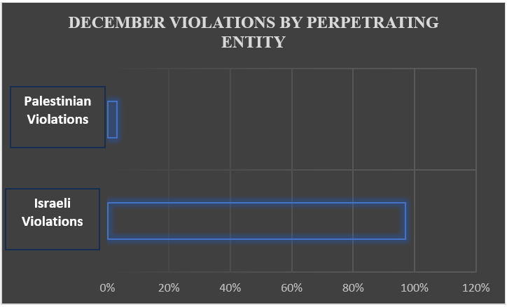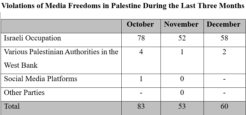 MADA documented during December 2025 a total of 60 (Sixty) violations against media freedoms (compared to 53 (Fifty-Three) violations in the previous month). The Israeli Occupation and settlers committed 58 (Fifty-Eight) of these attacks, while Palestinian Parties were responsible for only 2 (Two) violations.