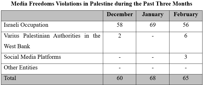 Israeli attacks and violations against Palestinian journalists and media freedoms declined relatively during February, with 56 (fifty-six) violations recorded, compared to 69 (sixty-nine) violations in January.