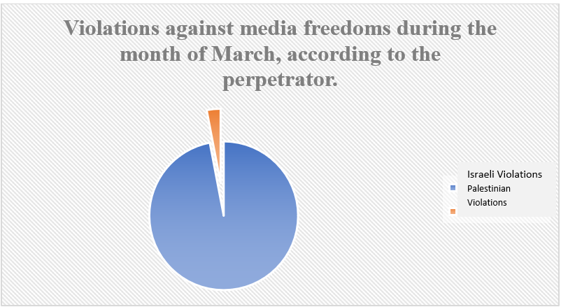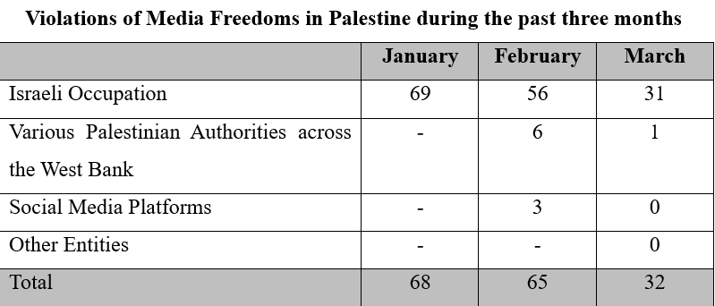 The Palestinian Center for Development and Media Freedoms “MADA” documented a total of thirty-two (32) violations against media freedoms during March, most of which occurred in the West Bank. The Israeli occupation committed thirty-one (31) of these violations, while Palestinian parties in the Gaza Strip committed a single (1) violation.